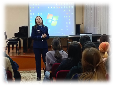 Өзінің әңгімесінде инспектор ұрлық, бопсалау, дене жарақатын келтіру, сондай-ақ қоғамдық орындарда никотин өнімдерін қолдану сияқты құқық бұзушылықтар мен қылмыстар үшін жауапкершілік мәселелерін қозғады. Жасөспірімдерге әкімшілік және қылмыстық жауапкершілік қандай жастан бастап қолданылатыны түсіндірілді.